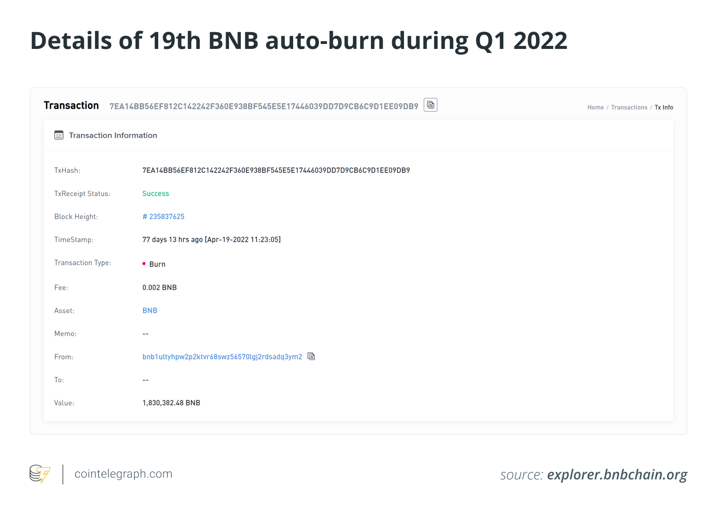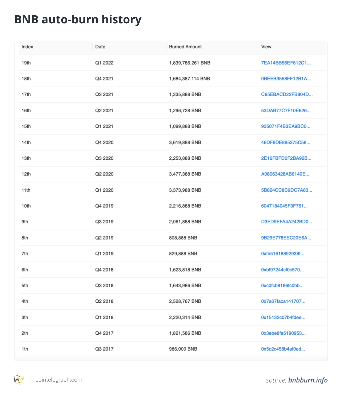 The quarterly burns are conducted using Binance’s profits and are announced well in advance. The specific amount of BNB to be burned is based on several factors including overall profitability, BNB circulating supply and the number of blocks produced per quarter. As of the most recent burn in April 2022, a total of 1,839,786.261 BNB have been burned: