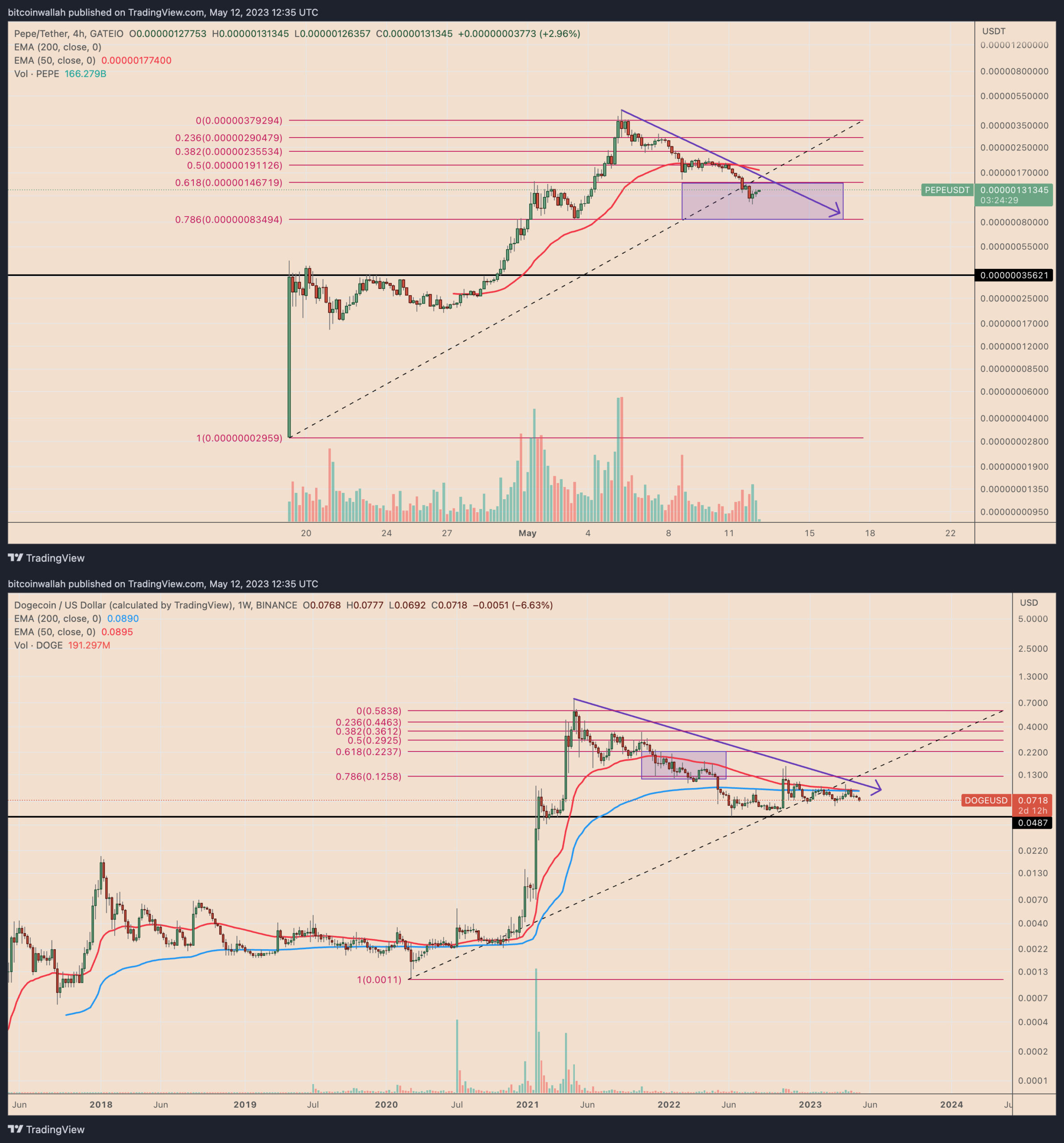 Notably, PEPE’s short-term gains appear identical to DOGE’s price rally on the weekly charts. Also, its ongoing correction looks similar to DOGE’s 90%-plus decline from its record high of $0.75 in May 2021.