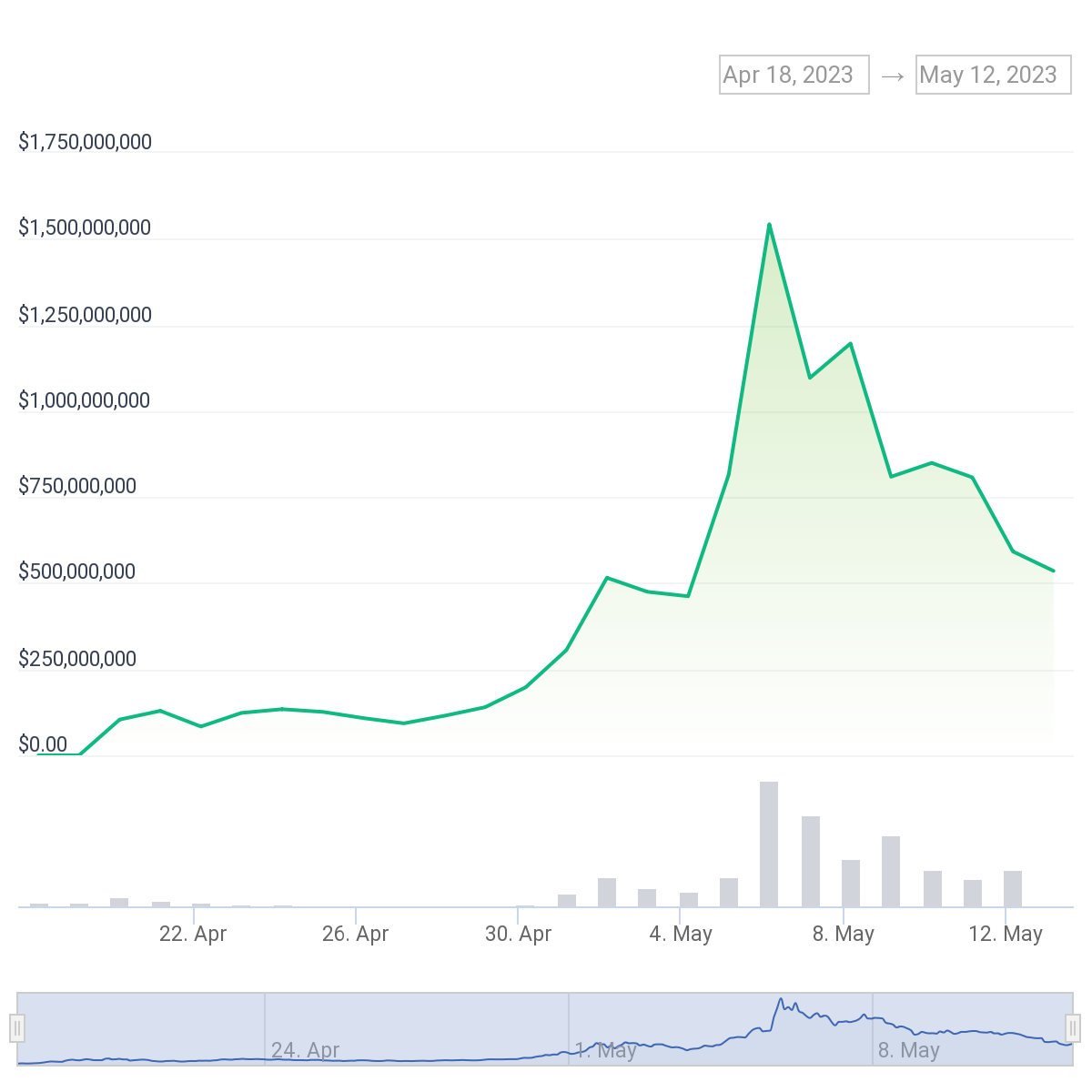 The market valuation of Pepecoin (PEPE) has dropped by 65% as of May 12, a week after its record high of $1.54 billion.