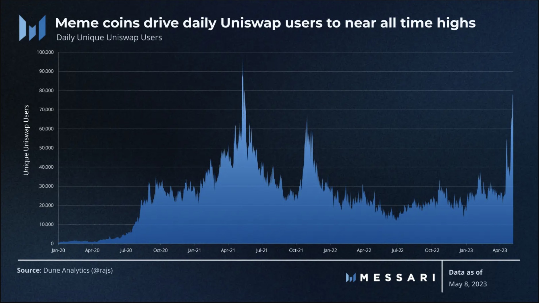 The launch of PEPE also coincides with the 100% rise in Uniswap’s daily active users on Ethereum, now approaching its all-time high of 90,000 from May 2021.
