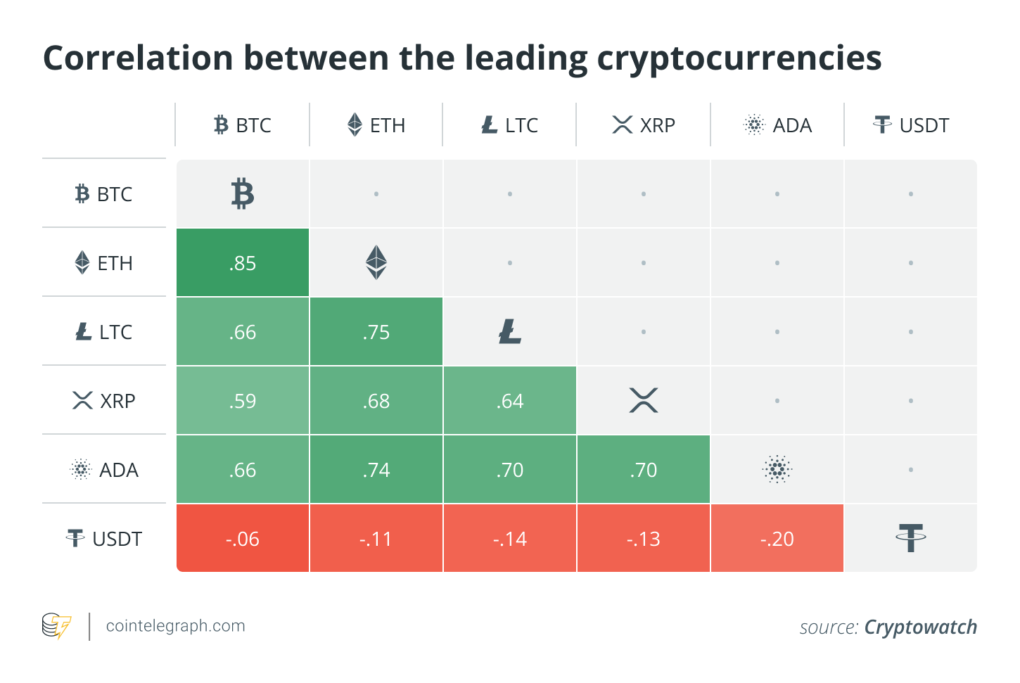 Another argument for the collapse of the classification of Bitcoin vs. altcoins is the varying correlations between BTC and other coins. While the correlation is high within some pairs, others demonstrate weaker dependence on each other. For instance, ADA and XRP show a lower correlation with other digital assets, not to mention that stablecoins such as Tether (USDT) show negative correlations.