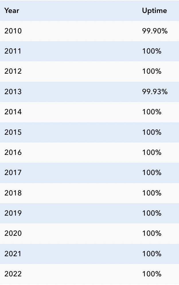 In 2013, Bitcoin software split, and the chain forked into two. The blockchain was down for 6 hours and 20 minutes causing a price drop of more than 23%, hitting lows of $37. Combining the downtime of the Bitcoin network between 2010 and 2013 creates roughly 0.01% of the total time.