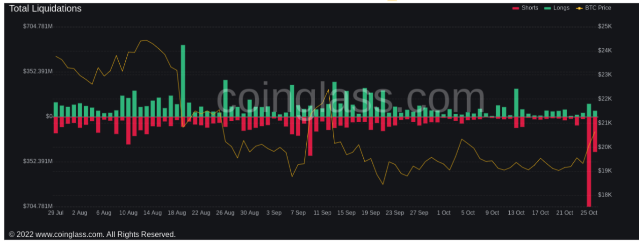 Data shows that Bitcoin short liquidations accounted for $550 million in liquidations in the past 24 hours. $704 million in cross-crypto shorts were liquidated on Oct. 25, with the Oct. 26 tally so far standing at $275 million.