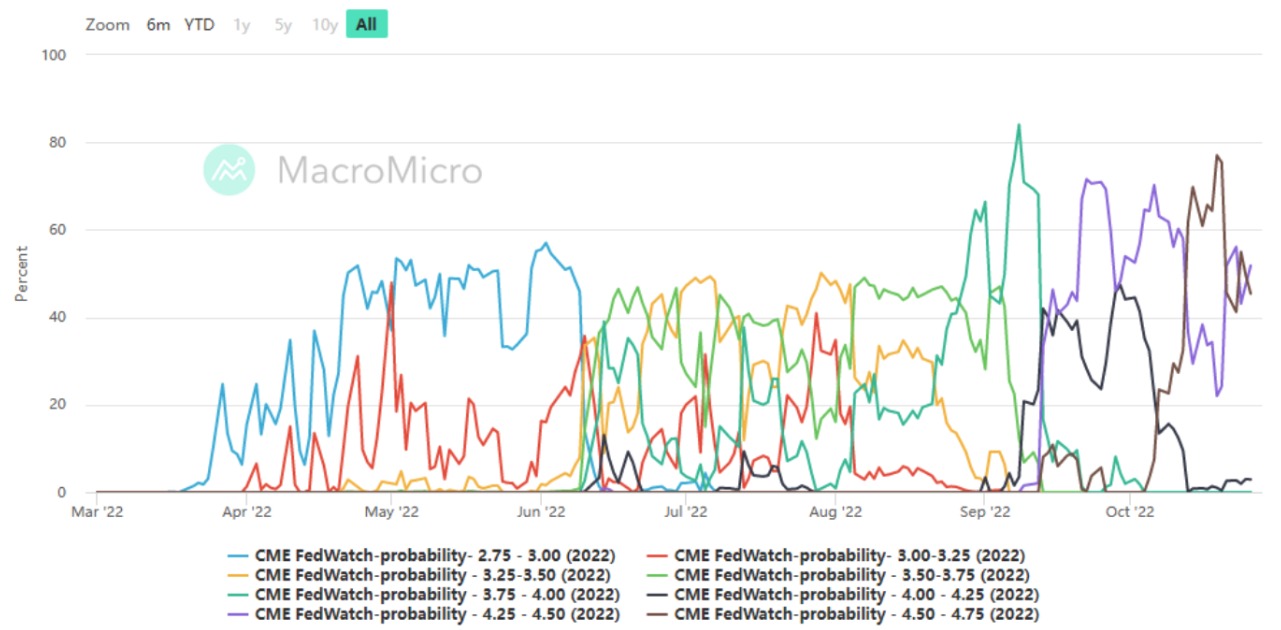 The graph points to a possible slow down in the interest rate hikes. The public sentiment shows that future rates may fall and investors believe that this has created the possibility for a broad crypto market recovery.