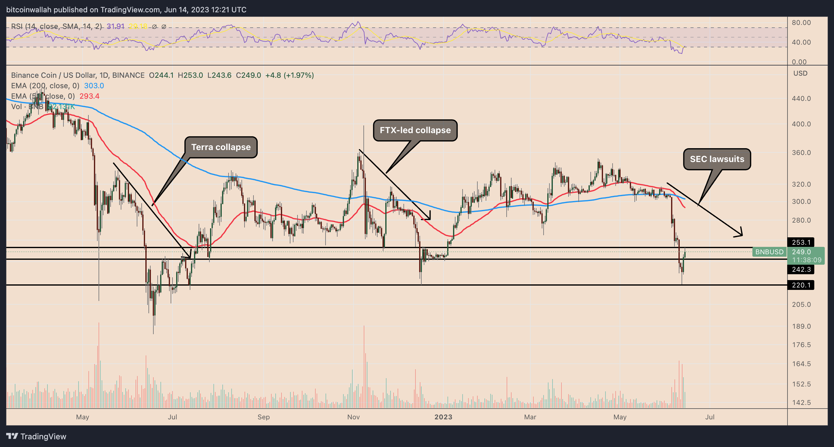 Each time, BNB price discovered strong support near $220, which the bulls will argue should make this level an ideal buy-zone after the SEC-led price drop — if history repeats.