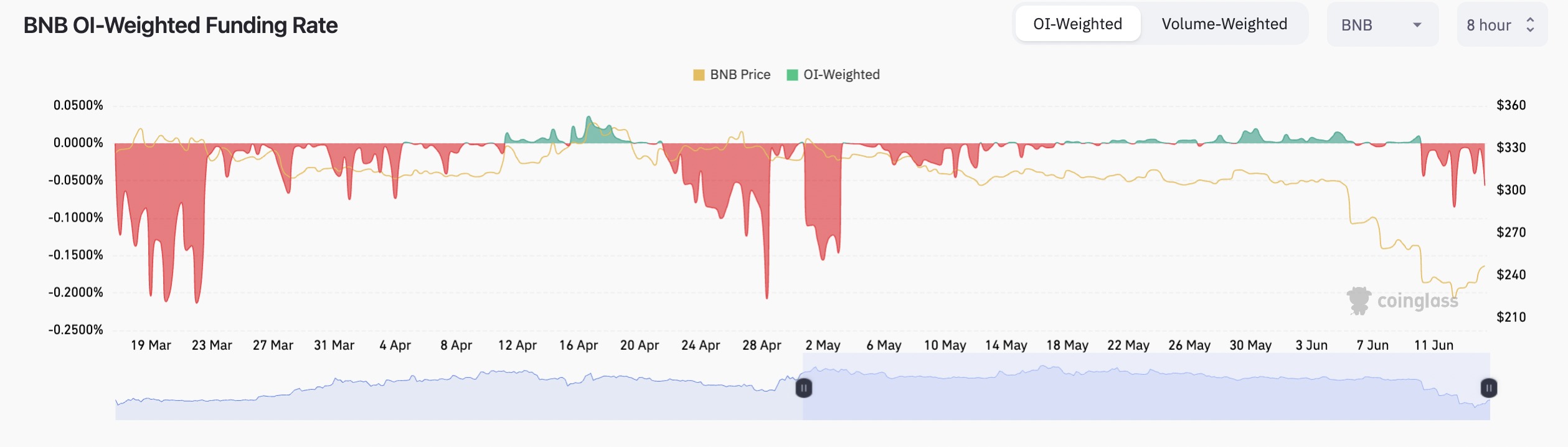 The funding rate of BNB slipped below zero on June 10 and has been negative since. In other words, bearish traders are willing to pay bullish traders to keep their short bets open.
