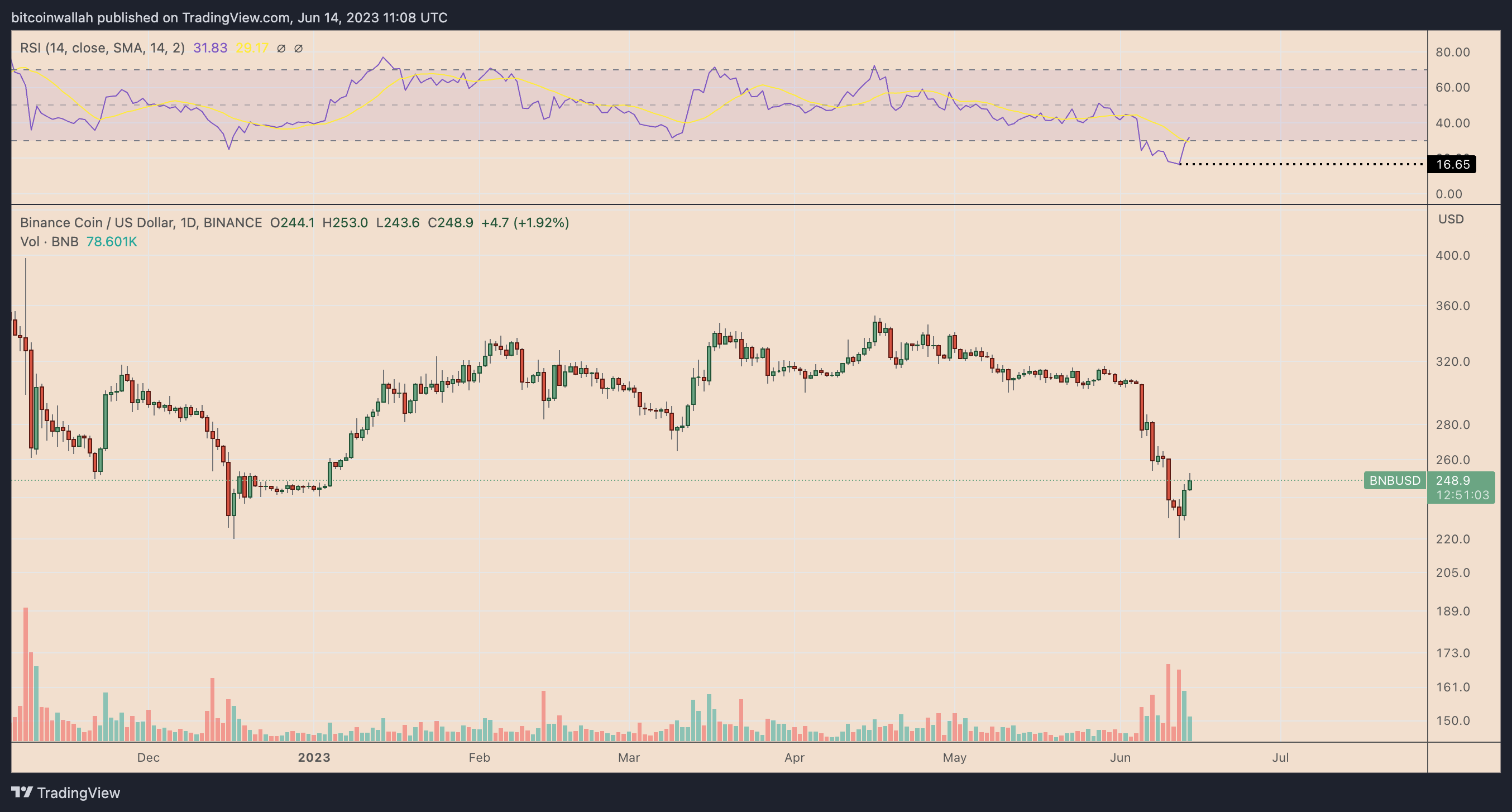 As of June 14, BNB/USD trades inside $240-250 range, a consolidation area from December 2022-January 2023.