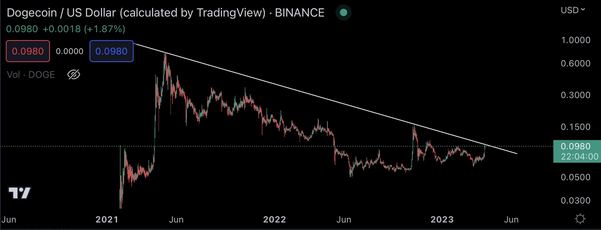 “When DOGE breaks out above the HTF downtrend here, I think $0.25 is a reasonable target,” he said.