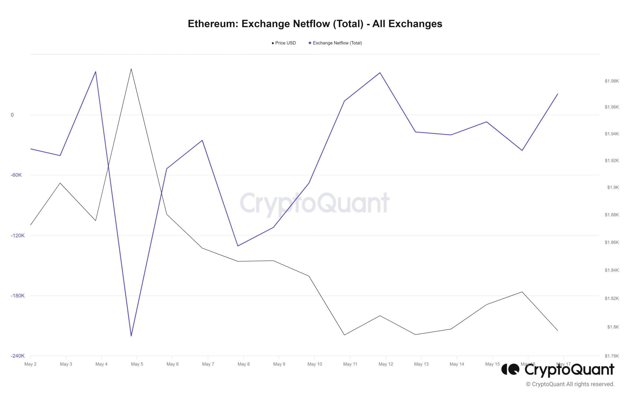 Ether’s price drop comes as centralized exchange netflow shows investors adding funds to centralized exchanges. In 24-hours on May 17, Ether deposited on centralized exchanges increased 119%. .