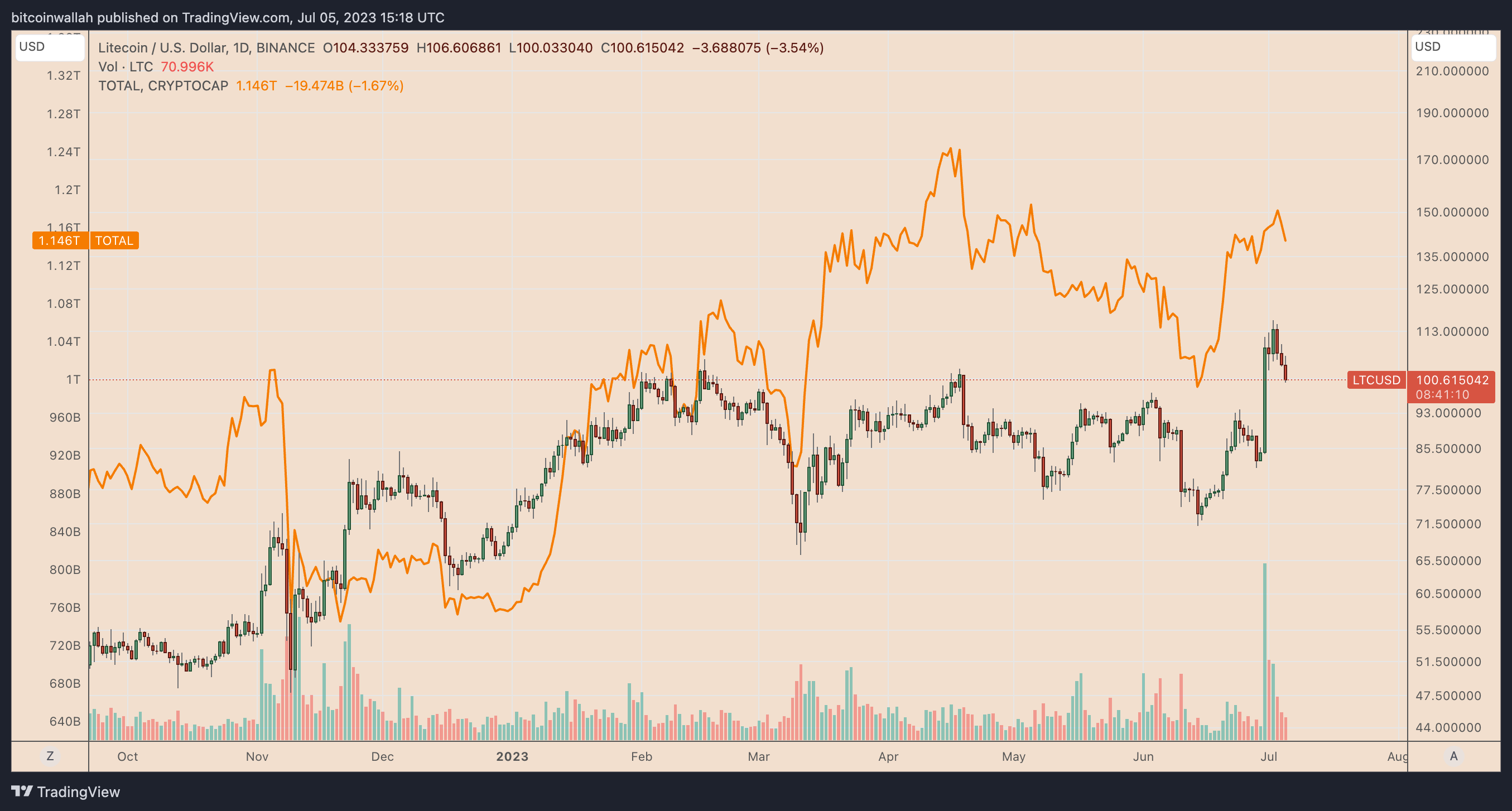 On July 5, the LTC price dropped over 3% to $100.50. On the same day, the crypto market’s overall capitalization fell 2%, suggesting traders have started securing profits at the local tops of multiple cryptocurrencies.