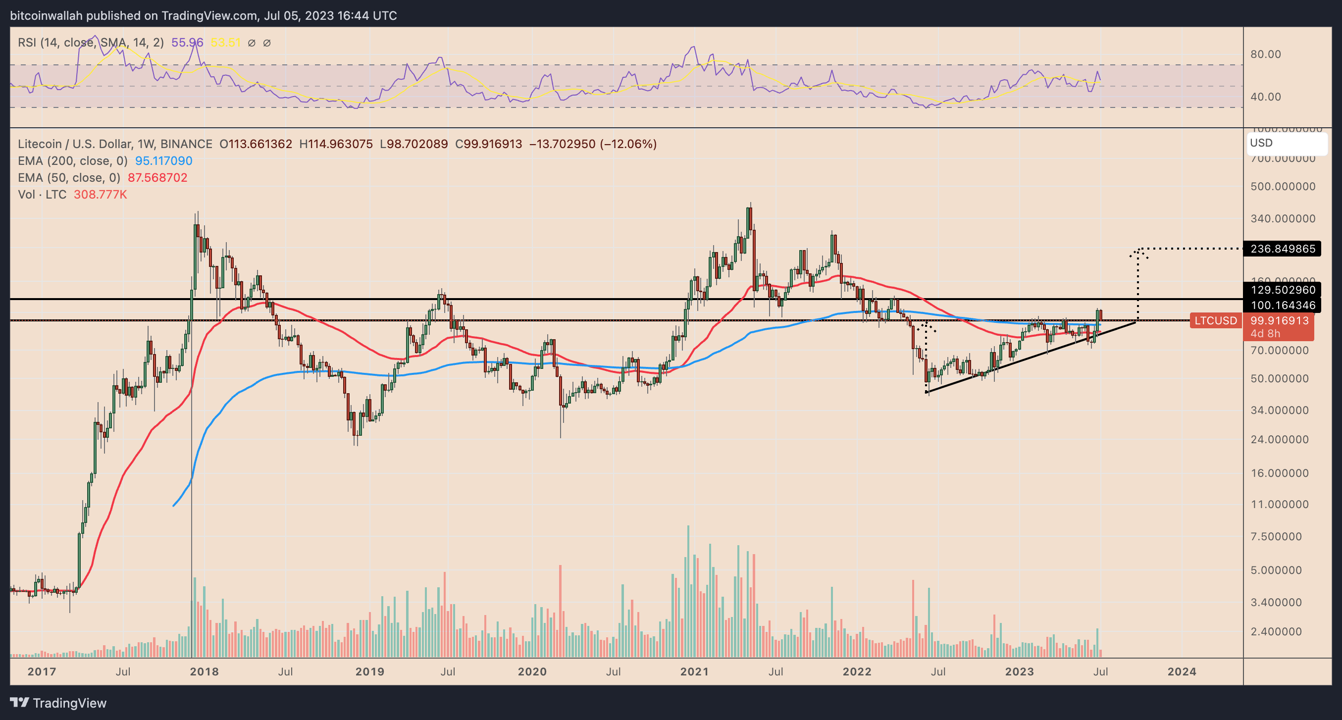 Litecoin now holds above $100, a level that has turned from resistance into support. As shown in the weekly chart below, this level has also served as the upper trendline of LTC’s prevailing ascending triangle pattern.