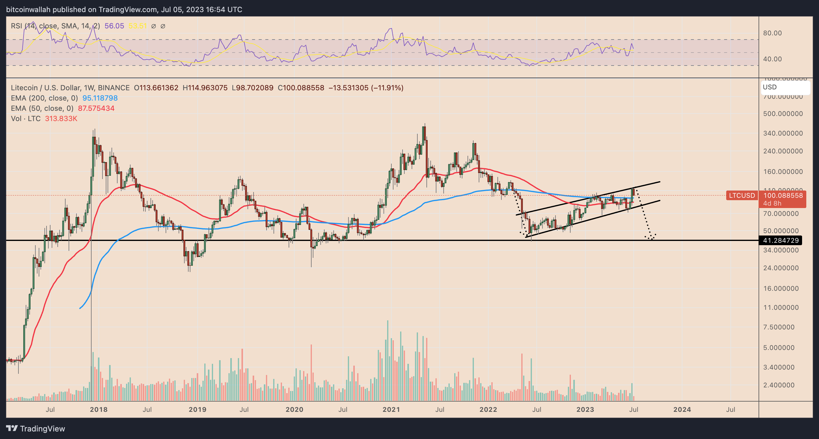 On the other hand, Litecoin price will drop if its ascending channel pattern plays out instead in the bearish scenario. This will involve LTC price testing the lower trendline at around $85 in Q3, down about 15% from current price levels.