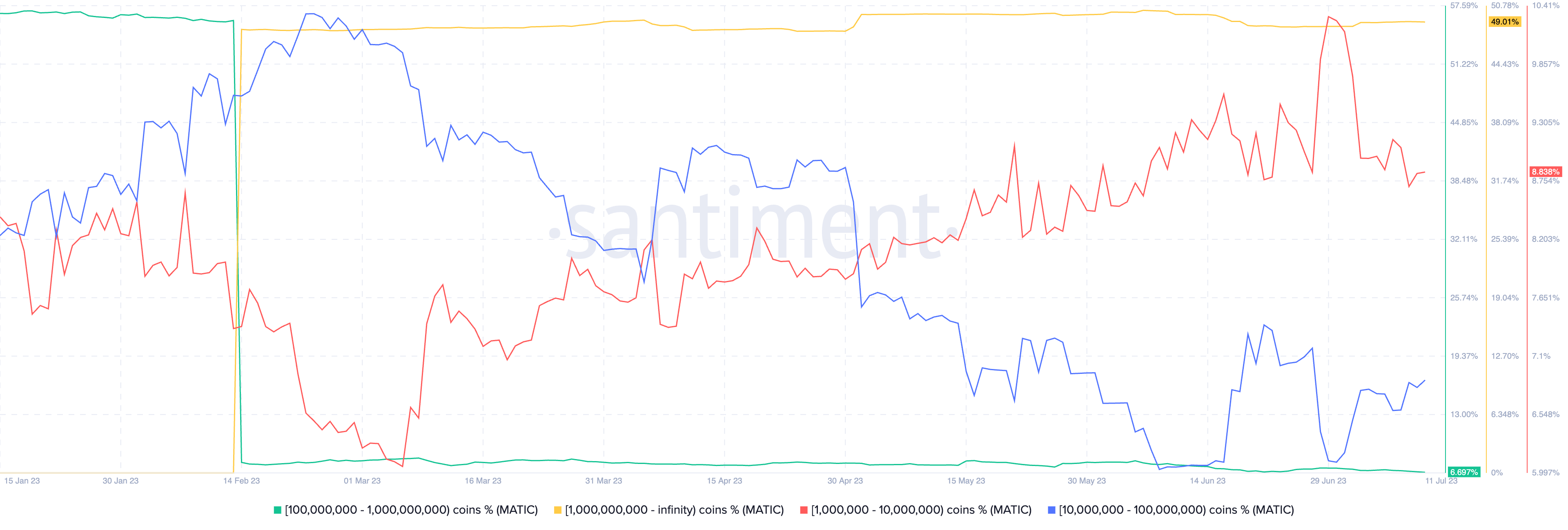 For instance, the supply of MATIC held by entities with balance between 10 million and 100 million tokens has increased by more than 1% in July so far.