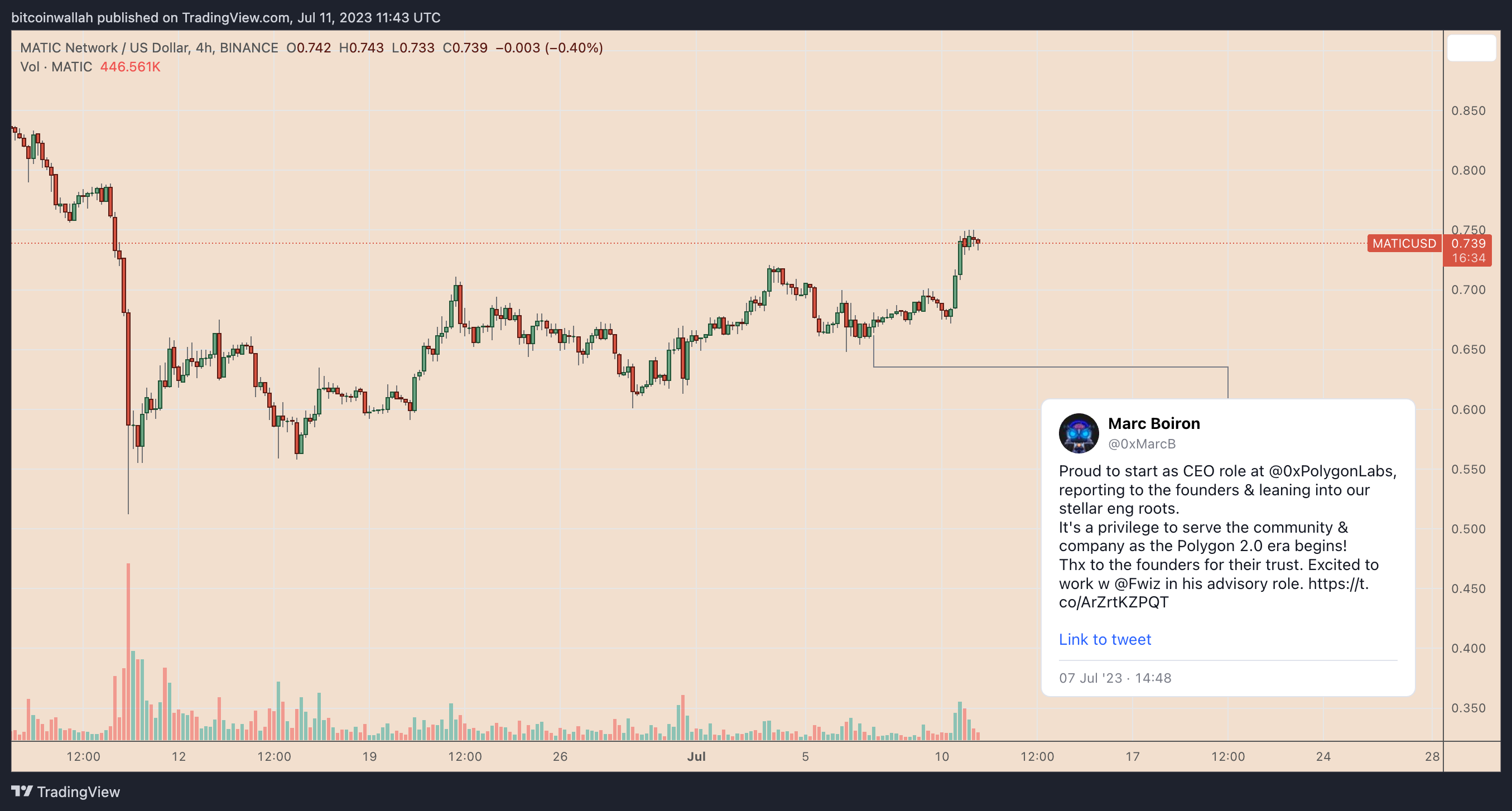 MATIC’s intraday gains come as a part of a broader price jump that started after Polygon appointed its former chief legal office, Marc Boiron, as the new chief executive officer (CEO) on July 7. Since then, MATIC/USD has gained nearly 15%.
