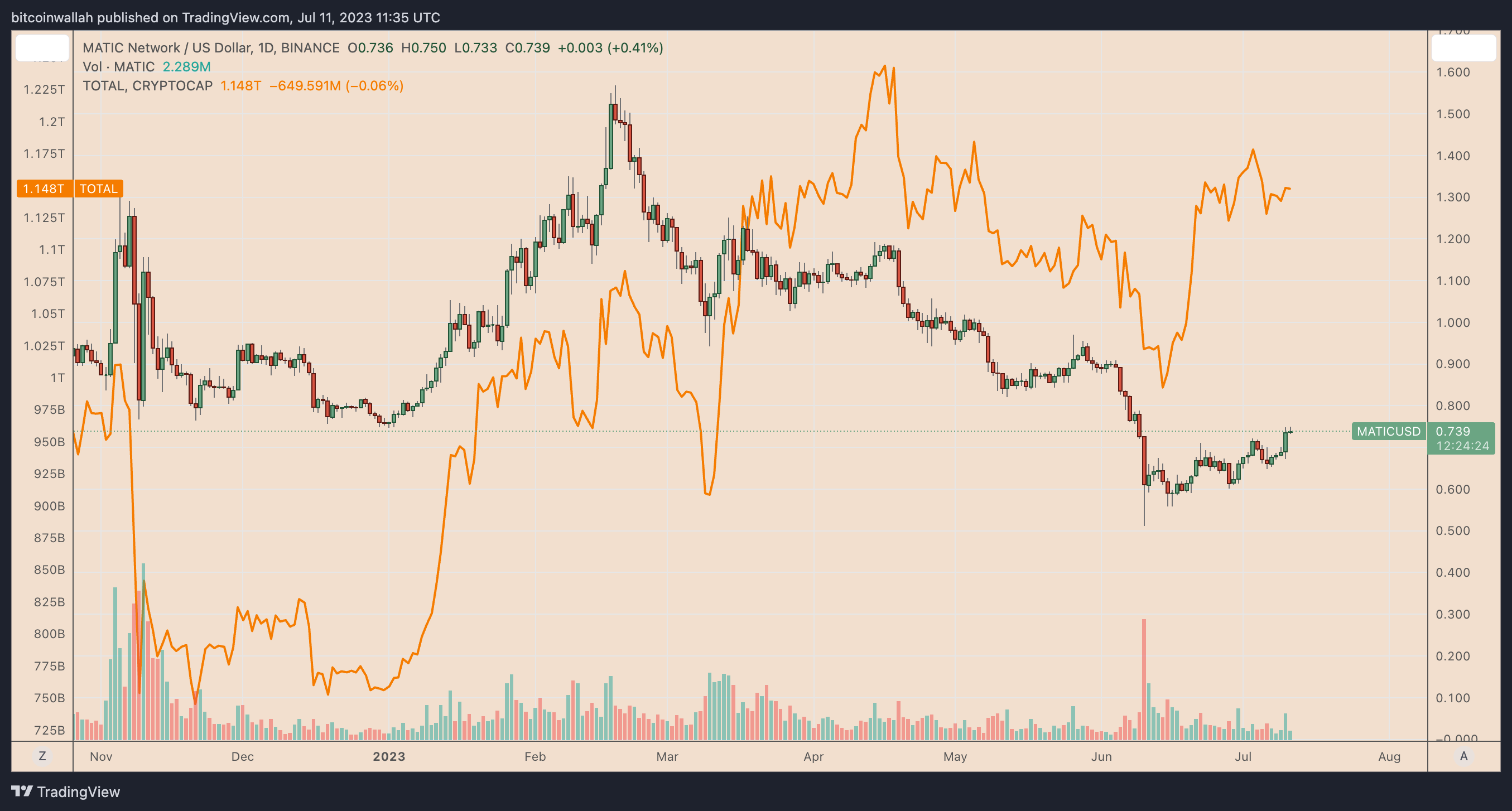 On July 11, the MATIC price rose 2.32% to $0.75, its highest level in a month — outperforming the crypto market, whose valuation stayed relatively unchanged from the previous day at around $1.14 trillion.