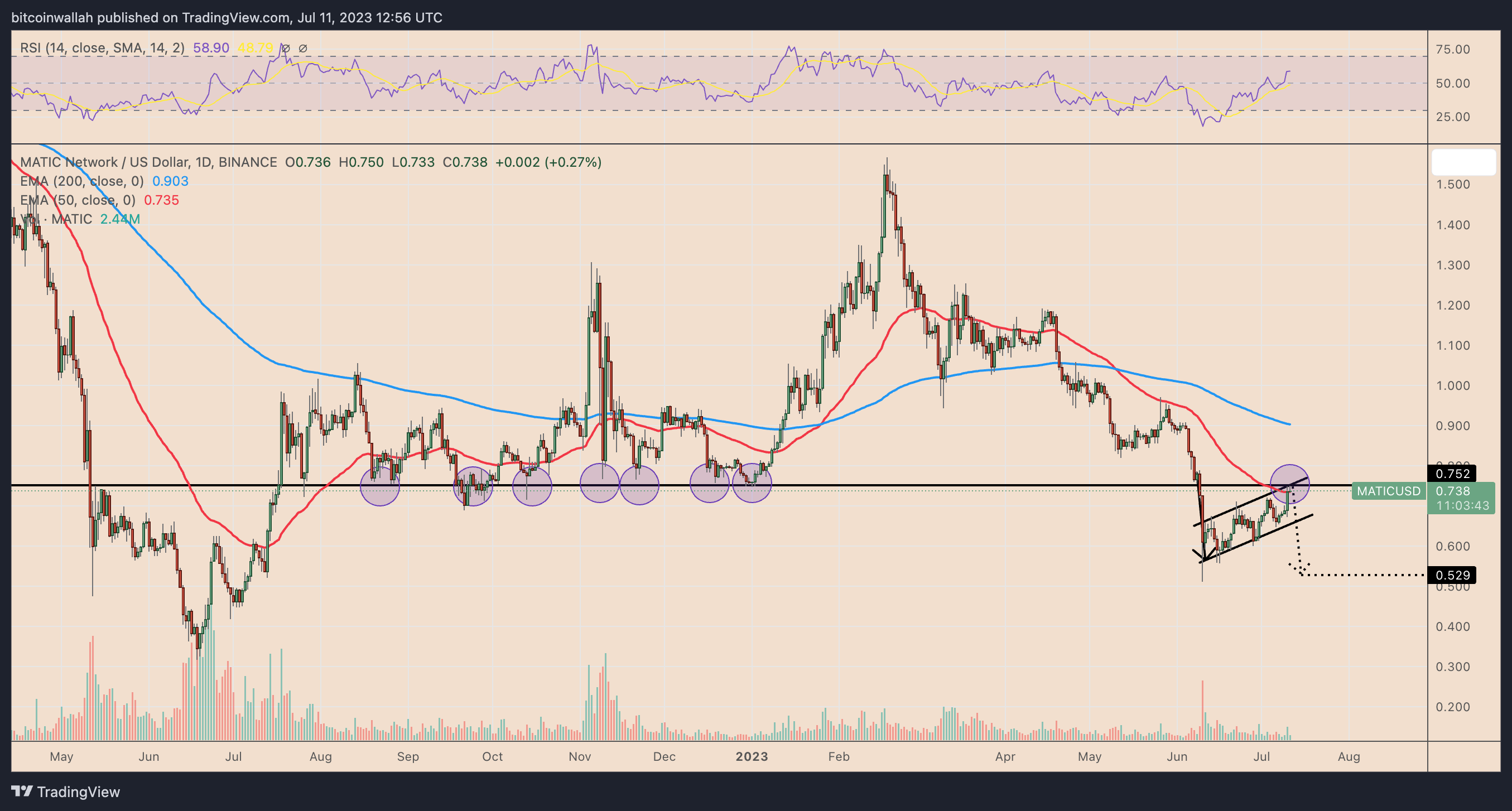 As of July 11, the Polygon token was testing a resistance confluence comprising its 50-day exponential moving average (50-day EMA; the red wave), a support-turned-resistance horizontal trendline, and an ascending trendline constituting a potential bear flag pattern.