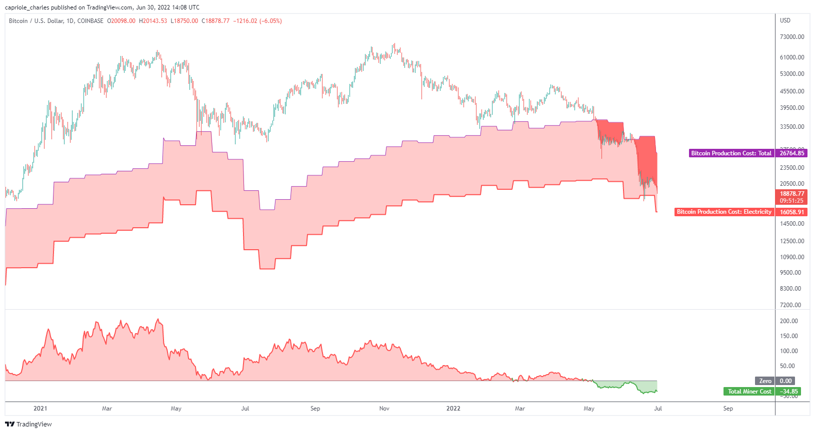 Data uploaded to social media by Charles Edwards, CEO of asset manager Capriole last week meanwhile puts the production cost for miners en masse at around $26,000. Of that, $16,000 is electricity, meaning that miner overheads directly influence their ability to limit losses in the current environment.