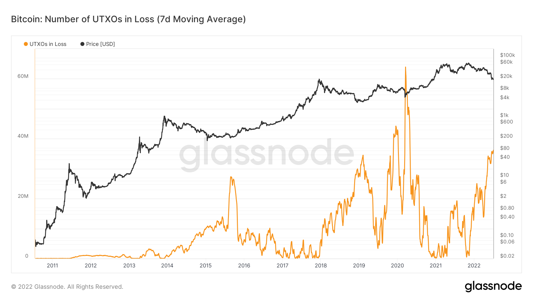 According to on-chain analytics firm Glassnode, the number of coins being spent at a loss is now the highest since July 2020. Glassnode analyzed the weekly moving average of unspent transaction outputs (UTXOs) in loss.