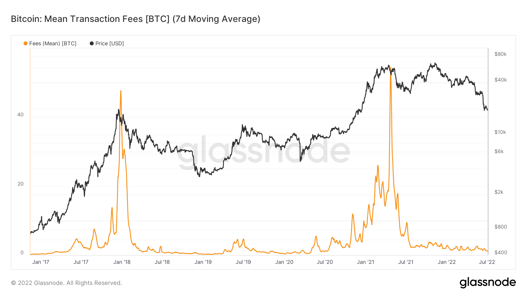 Bear markets can produce some welcome, if rare, silver linings. Bitcoin transaction fees, once painfully high during bullish periods of intense network activity, are now also at their lowest since July 2020. The median fee, Glassnode reveals, is $1.15.