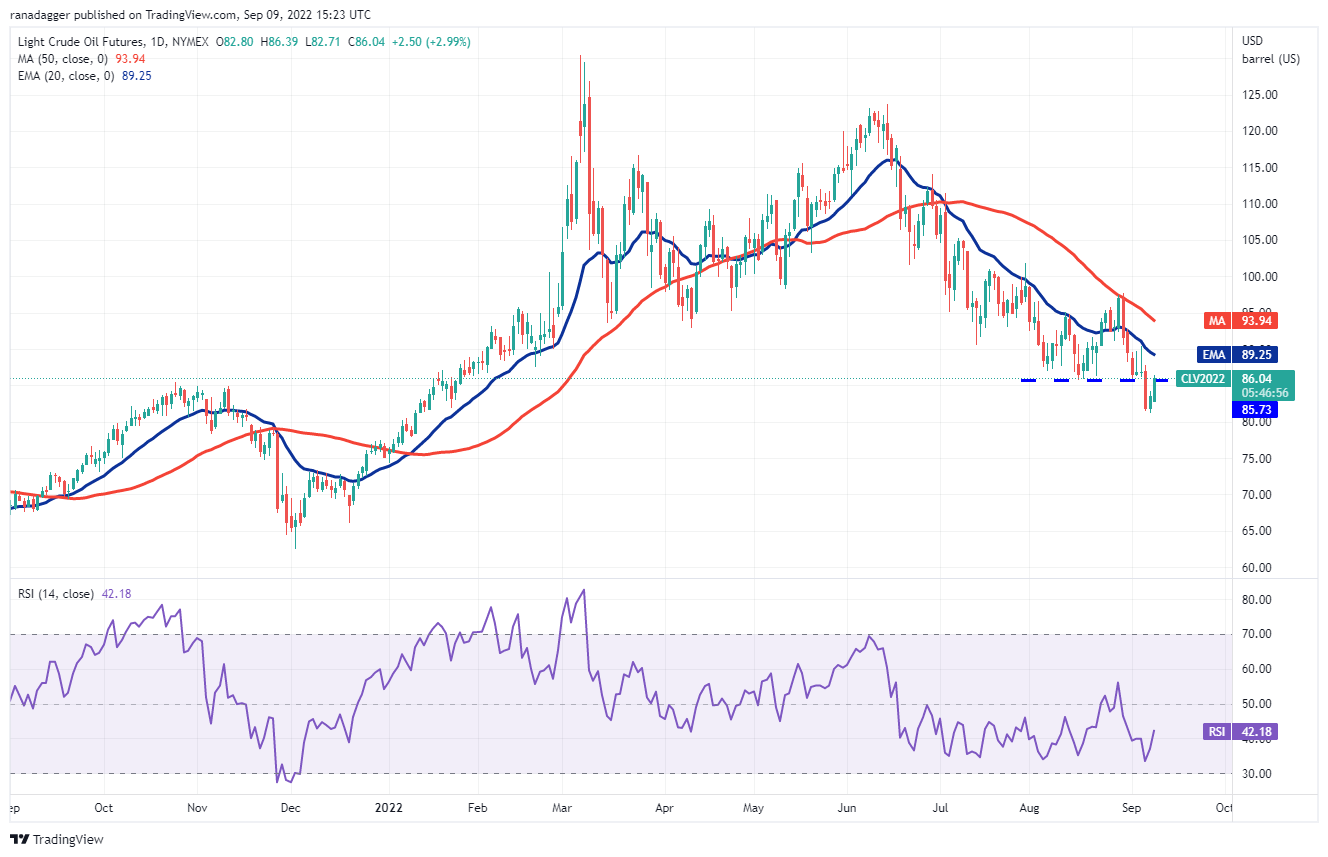 The bulls tried to arrest the decline near $85.73 but the level cracked on Sept. 7 and crude oil resumed its downtrend. A minor positive is that the bulls have not allowed the bearish momentum to pick up. This indicates buying at lower levels. The bulls are attempting to push the price back above the breakdown level of $85.73.
