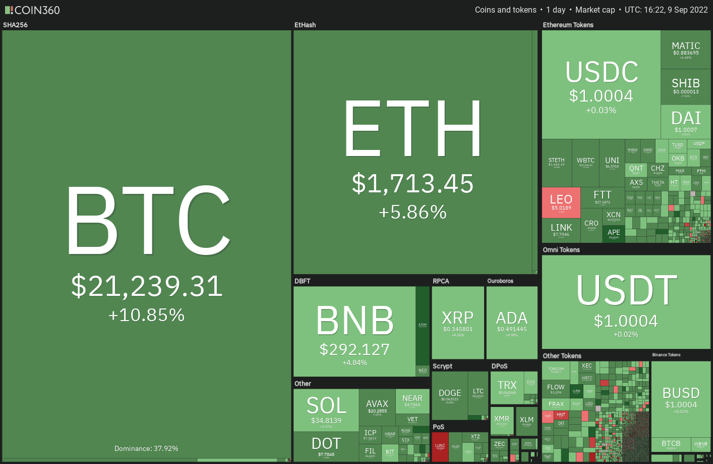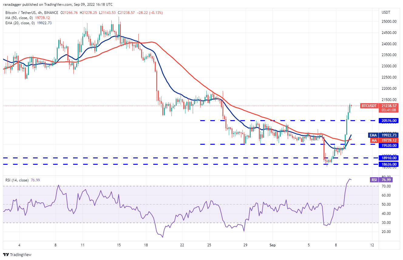 Bitcoin rebounded off the strong support at $18,626 on Sept. 7 and broke back above the breakdown level of $19,520 on Sept. 9. This may have triggered short-covering by the aggressive bears which propelled the price above the 20-day exponential moving average ($20,434).