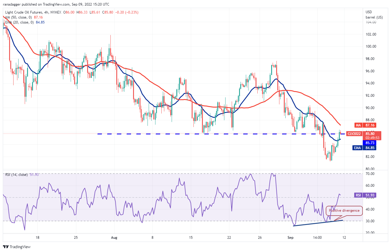 Crude Oil’s 4-hour chart shows a positive divergence on the RSI. This suggests that the negative momentum could be weakening. Buyers have pushed the price above the 20-EMA and the breakdown level of $85.73, which is the first indication that the selling pressure could be reducing. The rally could next extend to $88.