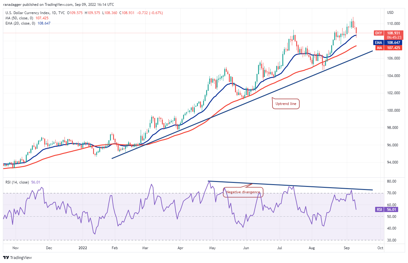 The U.S. dollar index (DXY) is correcting in a strong uptrend. After hitting a multi-year high at 110.78, the index has witnessed profit-booking which has pulled the price to the 20-day EMA ($108.64).