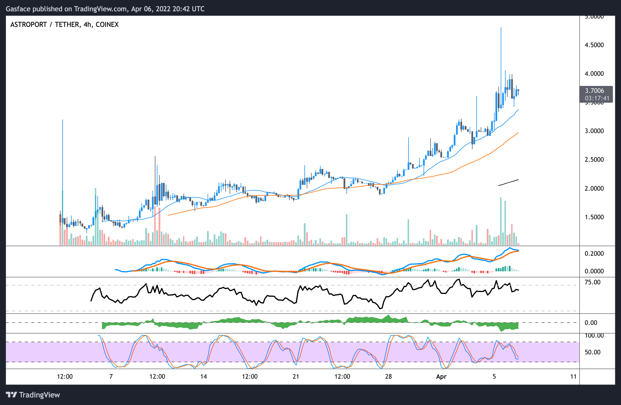 Data from CoinGecko shows that since hitting a low of $1.28 on March 7, the price of ASTRO has exploded 194% to hit a new all-time high of $4.80 on April 5.