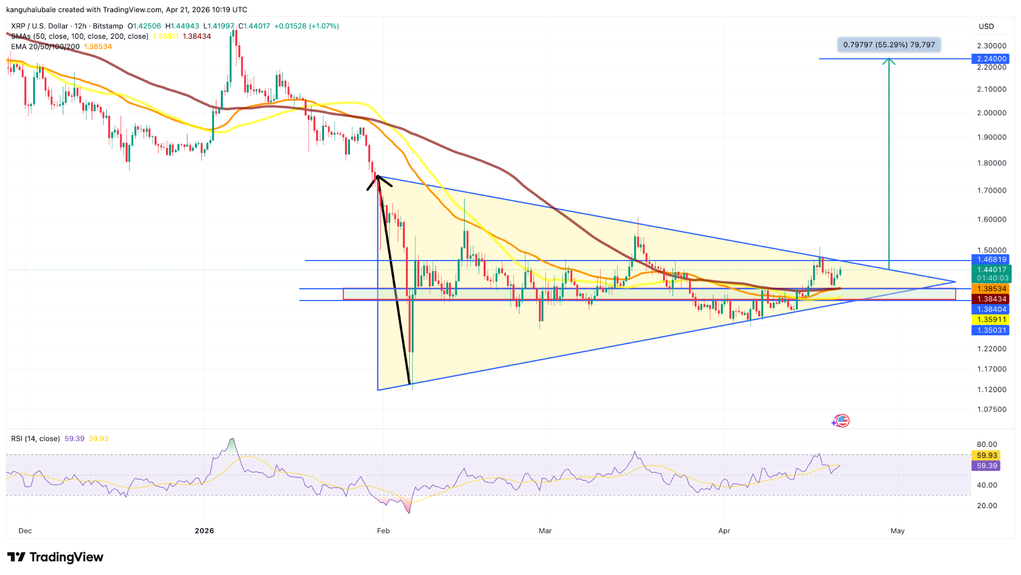 The XRP/USD pair must break and close above the upper trend line of the triangle at $1.46 to continue the upward trajectory.