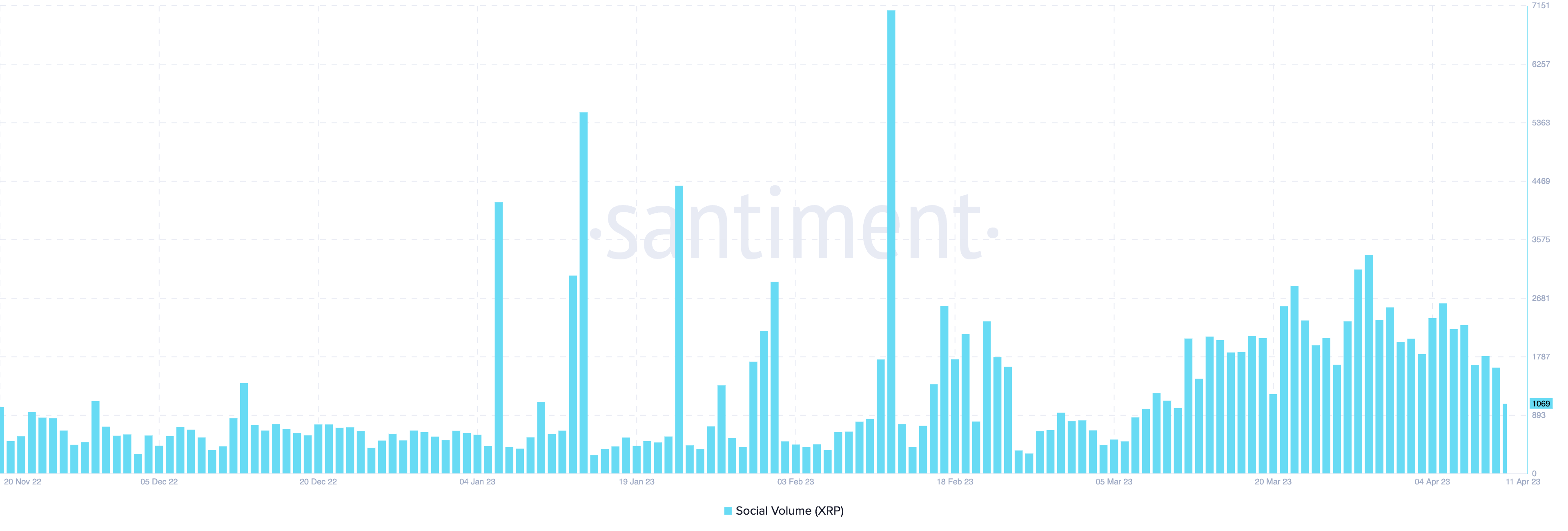 In addition, “XRP” social volumes dropped from their March highs, according to data tracked by Santiment.