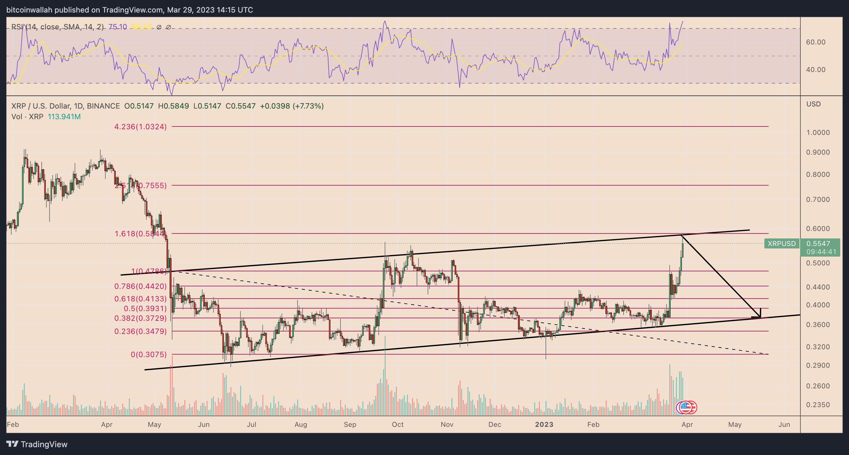 Technical indicators also show the XRP/USD pair facing the upper trendline of its prevailing rising channel. Thus, a correction toward the lower trendline is now in play, with the downside price target around $0.38 in April, down 35% from current price levels.