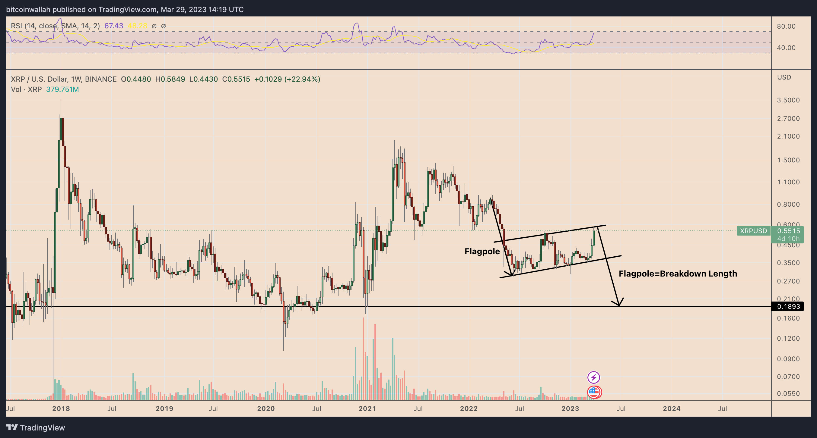 The completion of the flag pattern could see XRP price falling to $0.189 by June, down over 65% from current price levels