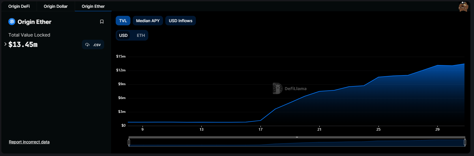 Once the public launch occurred on May 16, deposits to Origin Ether (OETH) rapidly accumulated, leading to a TVL of over $13 million by May 30. This is a gain of approximately $12.6 million over 14 days.