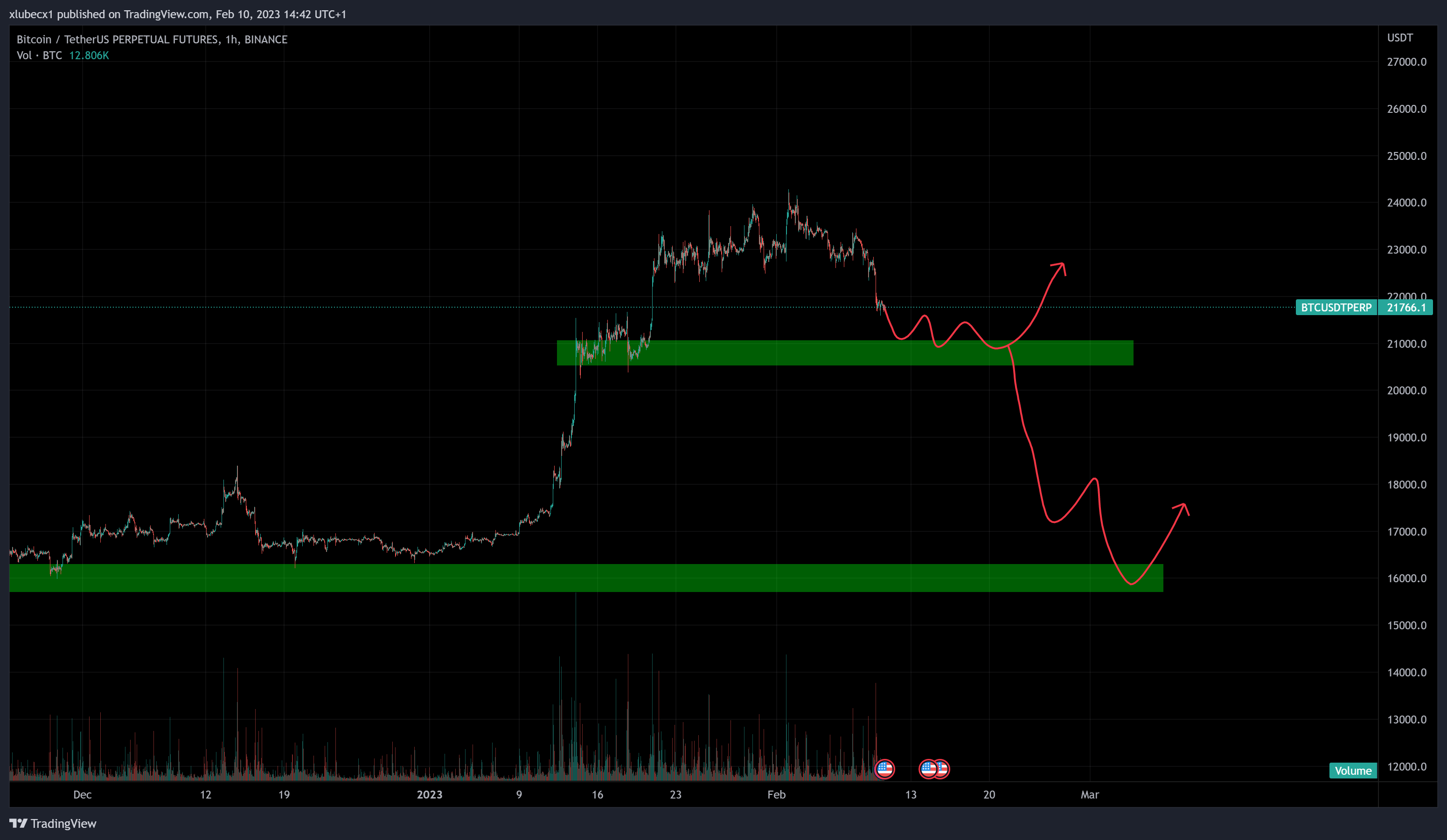 Optimálny scenár, ktorý treba brať s rezervou, pretože nikto nevie čo sa stane je lokálny pokles a konsolidácia bitcoinu nad 20 000 dolárov. Z fundamentálneho hľadiska sa blíži halving, ktorý vždy odštartoval zatiaľ so 100 % úspešnosťou rastúci trend. Negatívne udalosti, ktoré sa môžu dotknúť nie len neznámejšej kryptomeny sú pripravovaná regulácia MiCA. Zároveň sme nedávno informovali, že na trh sa môže dostať veľký objem bitcoinov zo skrachovanej burzy MtGox.