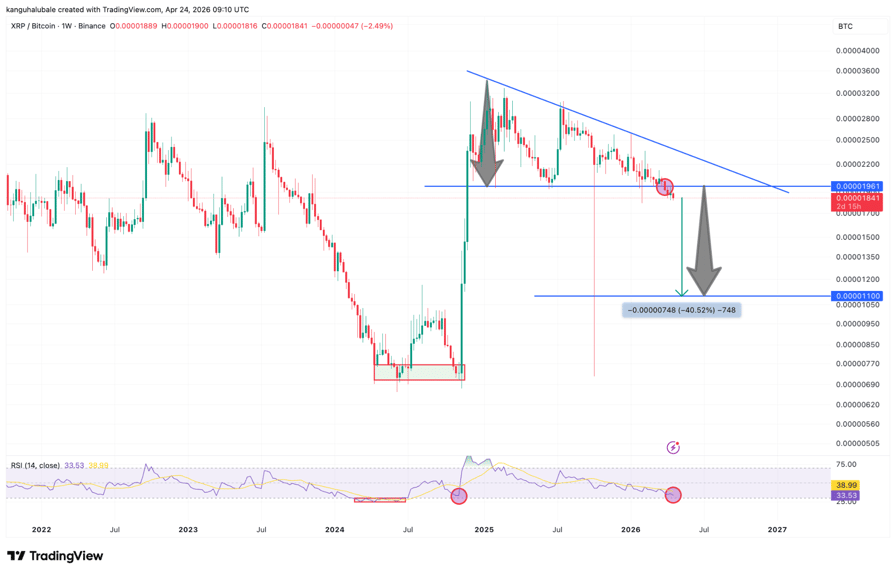 XRP (XRP) has fallen about 5% against Bitcoin (BTC) over the past week, and the confirmation of a bearish pattern now points to the risk of more losses ahead.Key takeaways:XRP/BTC’s descending triangle pattern on the weekly chart points to a possible 40% drop toward 0.000011 BTC.Persistent institutional demand through US-based... čítať ďalejPôvodný zdroj: https://www.coindesk.com/news Publikovaný: 24-04-2026 Vydal: Cointelegraph by Nancy Lubale - XRP price risks 40% decline versus Bitcoin despite 9-day ETF inflow streak