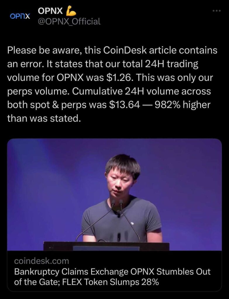 Nevertheless, Davies and Su decided to press forward with the idea anyway. On the first day of trading, the total trading volume on OPNX in the previous 24 hours was reportedly $1.26. The report drew swift condemnations from OPNX, which clarified that the exchange’s 24-hour trading volume was actually $13.64, or 982% more than stated.