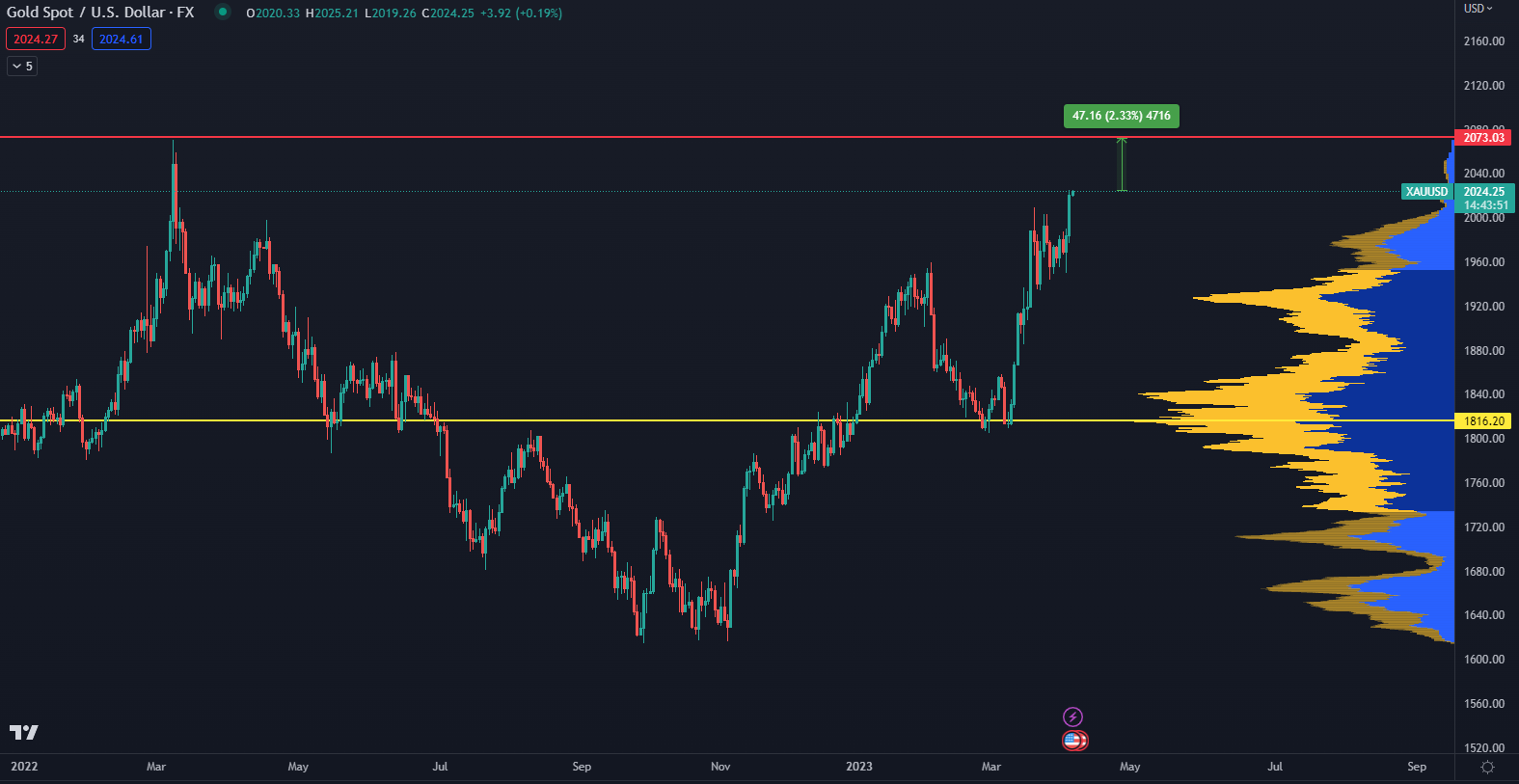 Zlato opäť začalo prudko stúpať a delí ho už len 2,30 % od dosiahnutia nového historického maxima, ktoré sa nachádza na hladine 2 075 dolárov. V súčasnej situácii investori hľadajú bezpečné útočisko kam ukryť svoj kapitál pred bankovou krízou uprostred nepriaznivého makroekonomického prostredia.