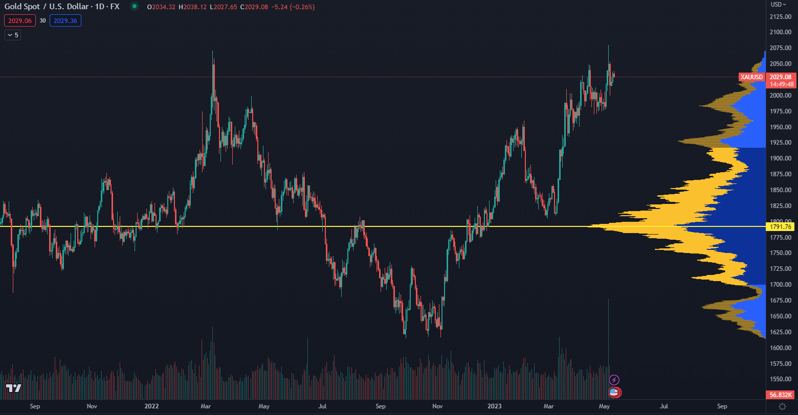 Zlato pokračovalo v raste aj napriek tomu, že FED aj ECB nedávno zvýšili úrokové sadzby o 25 bázických bodov. Podľa údajov z TradingView sa obchoduje na cenovej úrovni 2 029 dolárov v čase písania článku. Nedávno dokonca prekonalo historické maximum na úrovni 2 079 dolárov.
