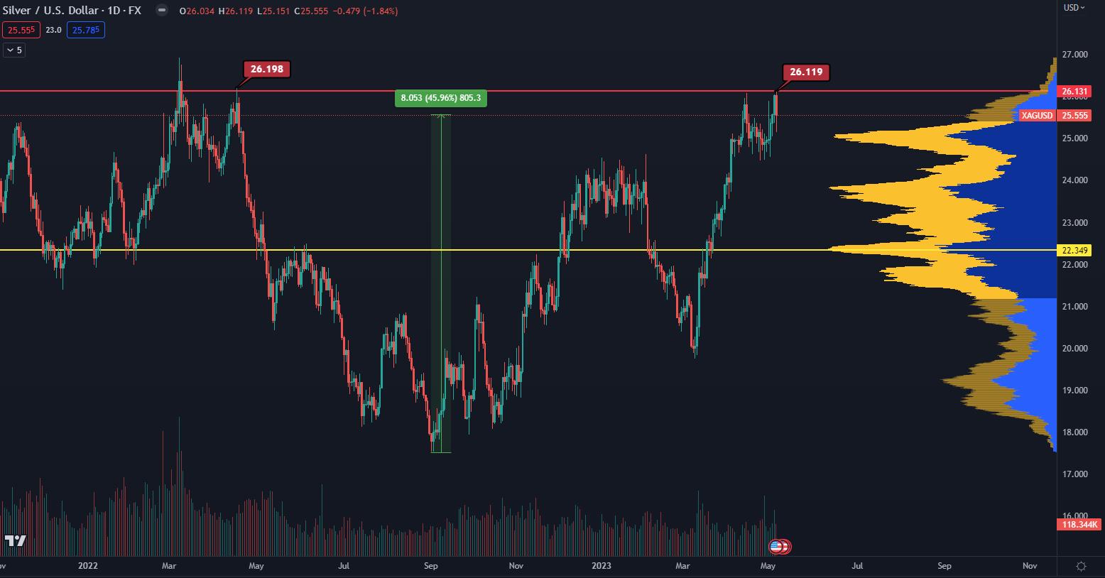 Podľa údajov TradingView sa trhová cena striebra nachádza v čase písania článku na úrovni 25,55 dolárov. Dňa 5. mája bol vrchol dosiahnutý na cene 26,12 dolárov, čo sme naposledy mohli vidieť 18. apríla 2022.